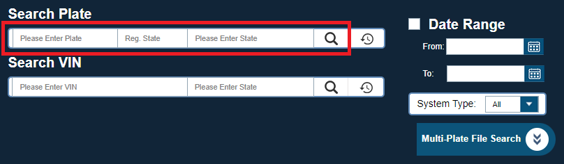 - Optionally, to narrow the search, enter the Reg. State of the plate, and a State in which the search will be performed. Enable Date Range to only display detections made in the selected range.