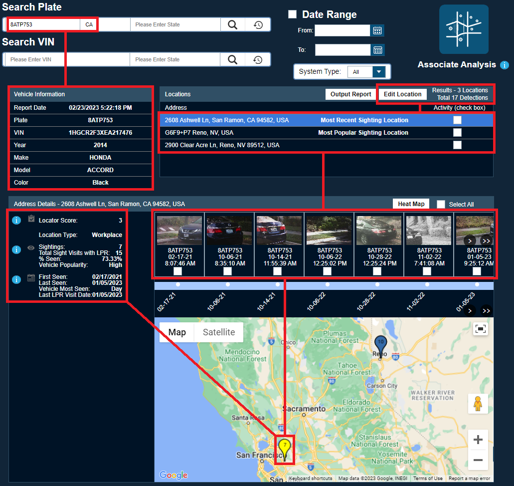 - View the Locator Score, Vehicle Sightings, Sighting Dates to the left of the Detections Filmstrip.