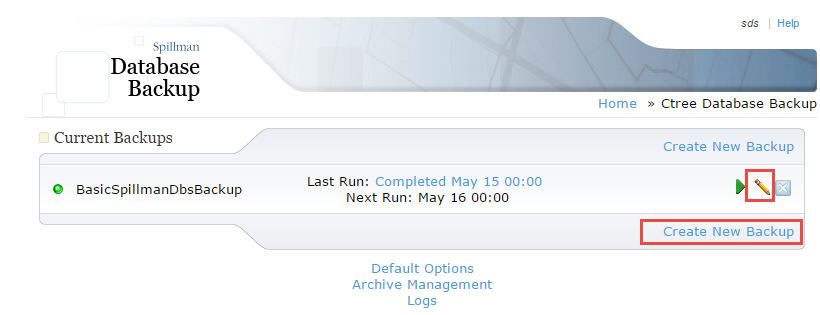 - Modifications can be made to an existing backup or a new backup can be created. Click the pencil icon to modify or the Create New Backup link to create a new backup:
