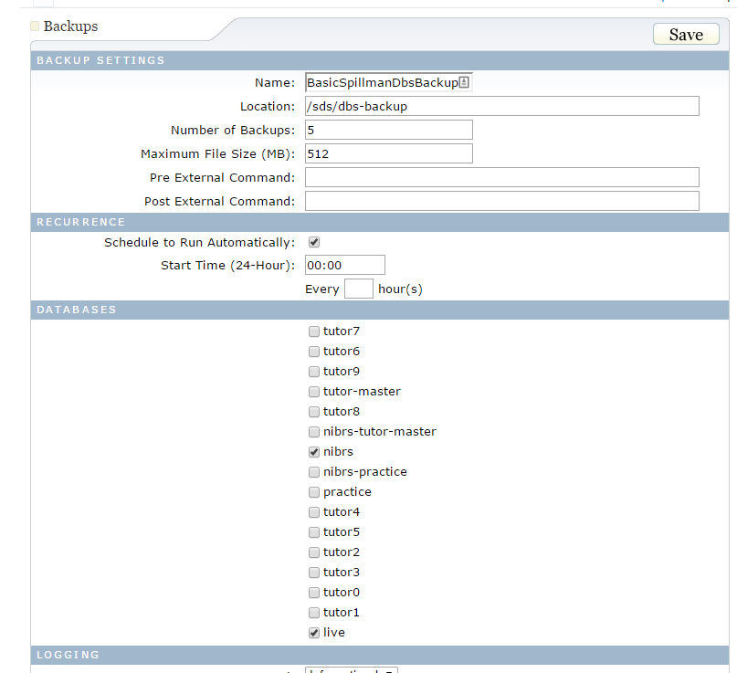 - The next page allows for changing of various settings such as database backup name, location, run time, and which databases to back up: