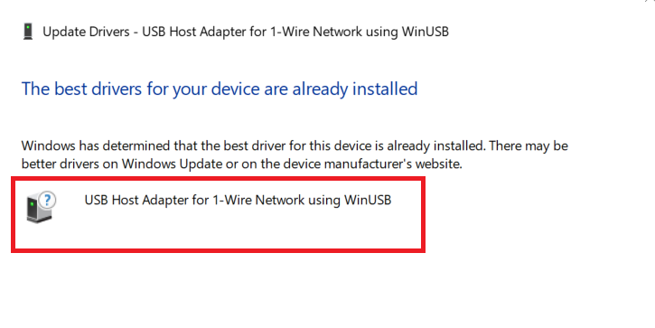 - Select the "USB Host Adaptor for 1-wire Networking using Win/USB" and install. After installation is complete a reboot may be required. Installation at this point is complete.