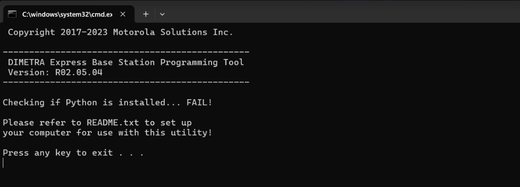 Customer was trying to program a Base Station using the DEX script. As per "readme.txt" file a Python 3.6.8 version was installed on the service PC (Windows 11 Pro). Site could not be programmed because the Python was not detected on the service PC. When running the batch file the following message was displayed: