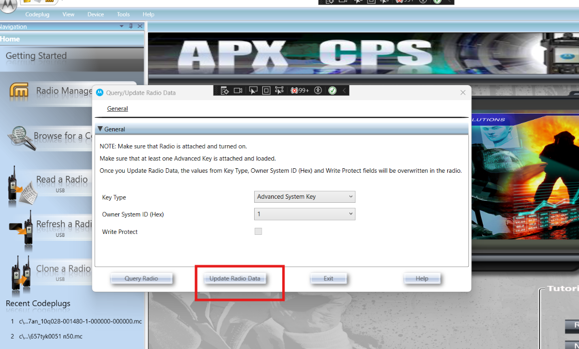 - Click Update Radio Data. Warning - Once you Update Radio Data, the values from Key Type, Owner System ID (Hex) and Write Protect fields will be overwritten in the radio.